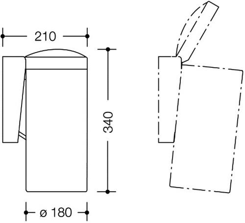 zylindrisch geformter Behälter mit Klappdeckel · Behälter abnehmbar · Deckel kann durch leichten Druck mit dem Knie gegen den Behälter oder mit der Hand geöffnet werden · integriertes Fach für handelsübliche Hygienetüten · nur zur Wandmontage geeignet · 330 mm hoch · 210 mm tief · Ø 180 mm · aus Polyamid